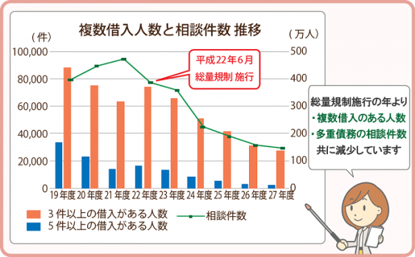 多重債務者の推移と、消費者センターに寄せられた多重債務に関する相談件数の推移を見ると、どちらも総量規制の完全施行となった平成22年以降一度も増加することなく、減少の一途をたどっている。