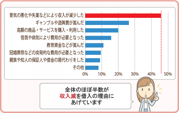 多重債務や借入残高が増加した半数は収入の減少に起因しているとも言える。