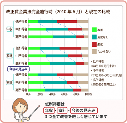 年収と家計の現状と見込みについて、年収を300万未満と600万円未満、600万円以上の3段階に分け、それぞれを低所得者、中所得者、高所得者と分類し、2010年と現在を比べて改善されたか悪化したかについての調査がある。