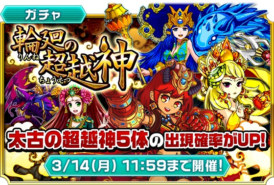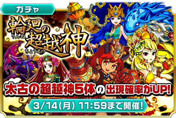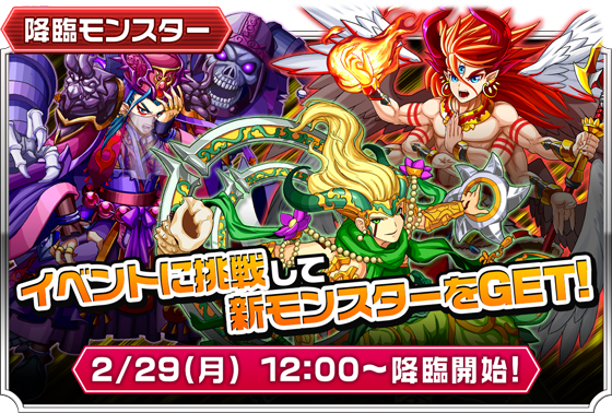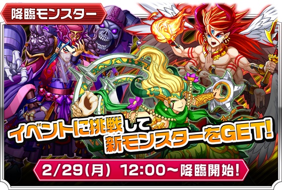 2月29日 (月)よりガチャに新作のモンスターが5体追加されます。新たに追加されたモンスターは同時に開催される「輪廻の超越神」イベントを有利に進めることができるモンスターです。また、期間限定で出現率をアップいたします。この機会に是非獲得し、ゲームを有利に進めてお楽しみください。