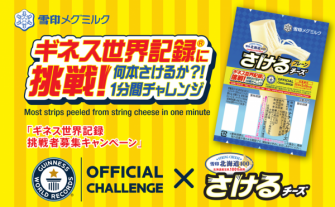 雪印メグミルク株式会社(本社:東京都新宿区、代表取締役社長:西尾 啓治)は、『雪印北海道100 さけるチーズ』を対象とした「ギネス世界記録(R)に挑戦!何本さけるか?!1分間チャレンジ」公式挑戦を平成28年6月19日(日)に実施します。そこで、平成28年3月1日(火)より5月16日(月)の期間で、「ギネス世界記録挑戦者募集キャンペーン」を実施いたします。