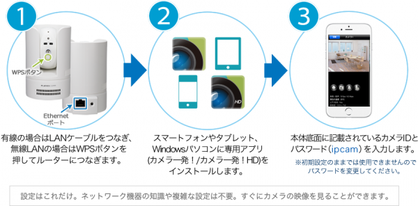 設定はこれだけ。ネットワーク機器の知識や複雑な設定は不要。すぐにカメラの画像を見ることができます。