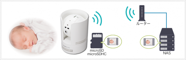 ネットワーク上に設置されているNASや本体に装着したmicroSD/microSDHCメモリカードへの録画に対応しており、常時録画の他にスケジュール録画や動体検知したときの映像を保存することが可能です。