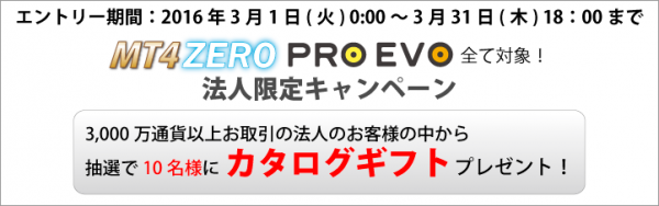 FX取引サービス「MT4・ZERO」を提供する外為ファイネスト株式会社(本社:東京都千代田区、代表取締役:石野由美子)は、2016年3月1日より、3,000万通貨以上お取引いただいた法人のお客様の中から抽選で10名様にカタログギフトをプレゼントする『法人限定キャンペーン』を開催します。