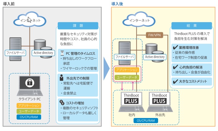 同社は、VDI(仮想デスクトップ)を含む多くのシンクライアント製品を評価しましたが、検証段階でさまざまな技術的な問題が生じたほか、VDIは膨大な初期投資と期間が必要となることから、いずれの製品も導入には至りませんでしたが、ThinBoot PLUSを評価した結果、既存のIT資産を最大限に生かしながらVDIと同等のセキュリティレベルを維持できる現実的な選択肢としてThinBoot PLUSが採用されました。
