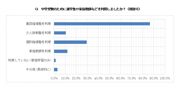 アンケートによると、中学受験に向けての勉強は「集団指導塾を利用」が8割を超え、「個別指導塾を利用」が3割、「少人数制塾を利用」「家庭教師を利用」がそれぞれ1割程度。「利用していない(家庭学習のみ)」との回答はわずか1%ほどでした。