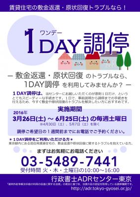 『1DAY調停』とは、お申込人の方もお相手の方も、当センターにお越しいただくのが調停当日の1日だけ、というスピーディーで便利なお手続きです。ご利用いただける方は、東京都内にある居住用賃貸住宅の敷金返還や原状回復を巡ってトラブルになっている賃貸人および賃借人の方です。『1DAY調停』は、引っ越しが増え、それに伴って敷金返還や原状回復のトラブルが多くなるこの時期に、期間限定で実施いたします。