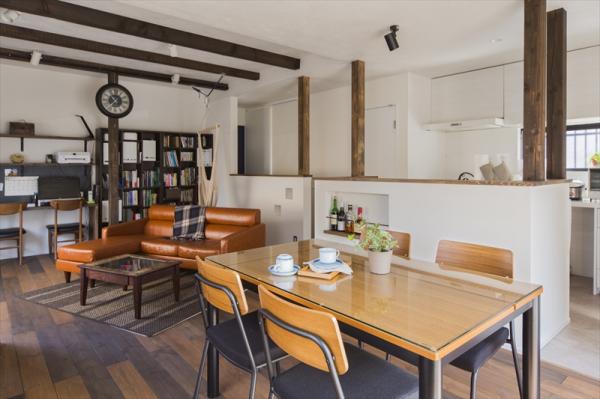 「中古住宅を購入し、リフォームにより広いLDKを実現させ、希望のインテリアに囲まれて暮らしたい」とのご要望からスタート。長い時間を過ごす1階と水廻りを中心にリフォーム。ハンモックを付けることの出来る梁、造り付けのワークスペース、生活感の出ないオープンキッチンを設置しました。柱や梁をたくさん見せながら、ラフでリラックス感たっぷりの空間が実現しました。