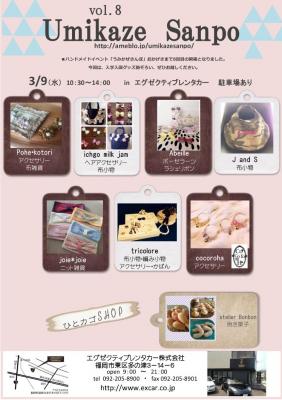 2016年3月9日10:30~14:00に女性の方が、もっと輝ける場所を提供したいとの思いから女性のためのハンドメイドイベント「うみかぜさんぽ vol.8 ~入学入園~」をエグゼクティブレンタカーにて開催いたします。