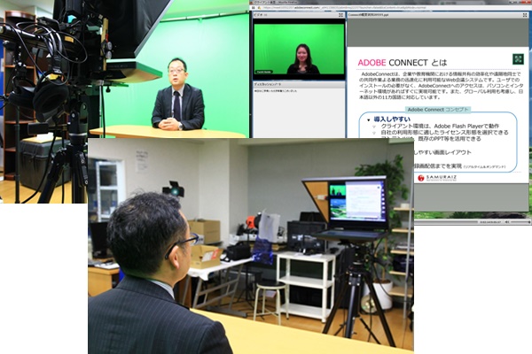 サムライズが提供する「Adobe Connect」(アドビコネクト)は、世界的なソフトウェアメーカーであるアドビシステムズ社が開発するWeb会議システムです。国際的な会議などでも利用されている「Adobe Connect」を利用し、テレプロンプターで撮影したライブ映像を社内外の視聴者に対し手軽にライブ配信する事が出来ます。 「テレプロンプター」で撮影したカメラ映像を「Adobe Connect」で取込み、読み上げているパワーポイントやPDFなどの文書ファイルと同一画面で視聴者にネット配信できます。また、配信している画像は同時に録画も可能なので、再度ビデオ動画として配信も可能です。