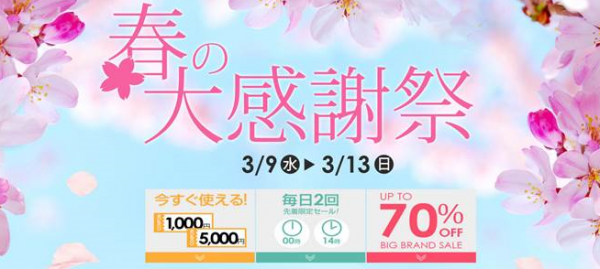 『春の大感謝』セールでは、毎日2回(0時・14時)の〝先着限定セール!″や、人気のコスメ・電化製品・腕時計・トランクケース・シューズ等が、最大で70%割引となる〝BIG BRAND SALE″が実施されています。さらにセール期間中は毎日、総額25,000円以上の商品の購入で5,000円割引のカートクーポンが先着5,000名様に、総額5,000円以上の商品の購入で1,000円割引のカートクーポンが先着5,000名様に付与されます。