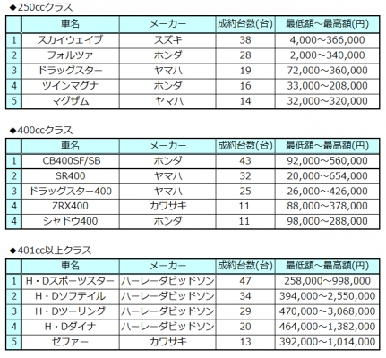 今後もオークネットでは、モーターサイクル市場での成約ランキングのほか、様々な注目度の高い情報を発信して参ります。