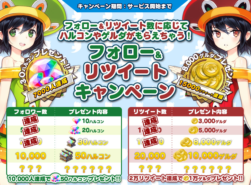 公式アカウント(@info_trickster)のフォロー数、公式ツイートのリツイート数に応じて、ハルコンやゲルダをプレゼントします。