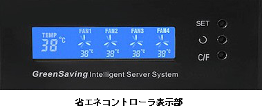 システム前面に配置された2台の8cm吸気ファンは、システム内部温度の上限を30から60の範囲でプリセット(出荷時設定38)可能で、4台までのファンを個別に制御し、その動作状態をLCDパネル上に表示する省エネコントローラに接続されています。システムの消費電力を抑制し、システム冷却ファンの寿命を延長すると共に、システム動作音を約30dBに低減します。ファンに障害が発生した場合は、LCDパネル上に表示され、リセット付きのアラームで通知されます。