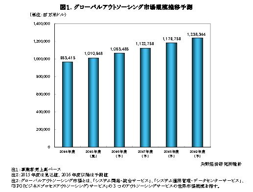 本調査におけるグローバルアウトソーシング市場とは、「システム開発・統合サービス」、「システム運用管理・データセンターサービス」、「BPO(ビジネスプロセスアウトソーシング)サービス」の3 つのアウトソーシングサービスの世界市場を指し、事業者売上高ベースで算出した。