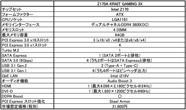 30周年記念モデルの開発にあたり、「Z170A KRAIT GAMING 3X」では、USB 3.1 Gen.2 Type-Cコネクタの採用以外にも、PCIスロットからPCI Express 3.0 x1スロットへの変更、水平タイプのSATAコネクタの採用など、機能強化を図っています。なお、その市場想定価格は21,800円(税別)の見通しです。主な仕様は別表のとおりです。