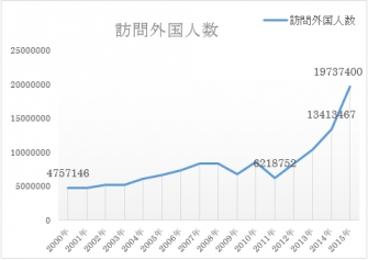 その一方、訪問外国人の人数は、2011年の6,218,752人から20015年19,737,400人とわずか4年間で約3倍と飛躍的に増えております。