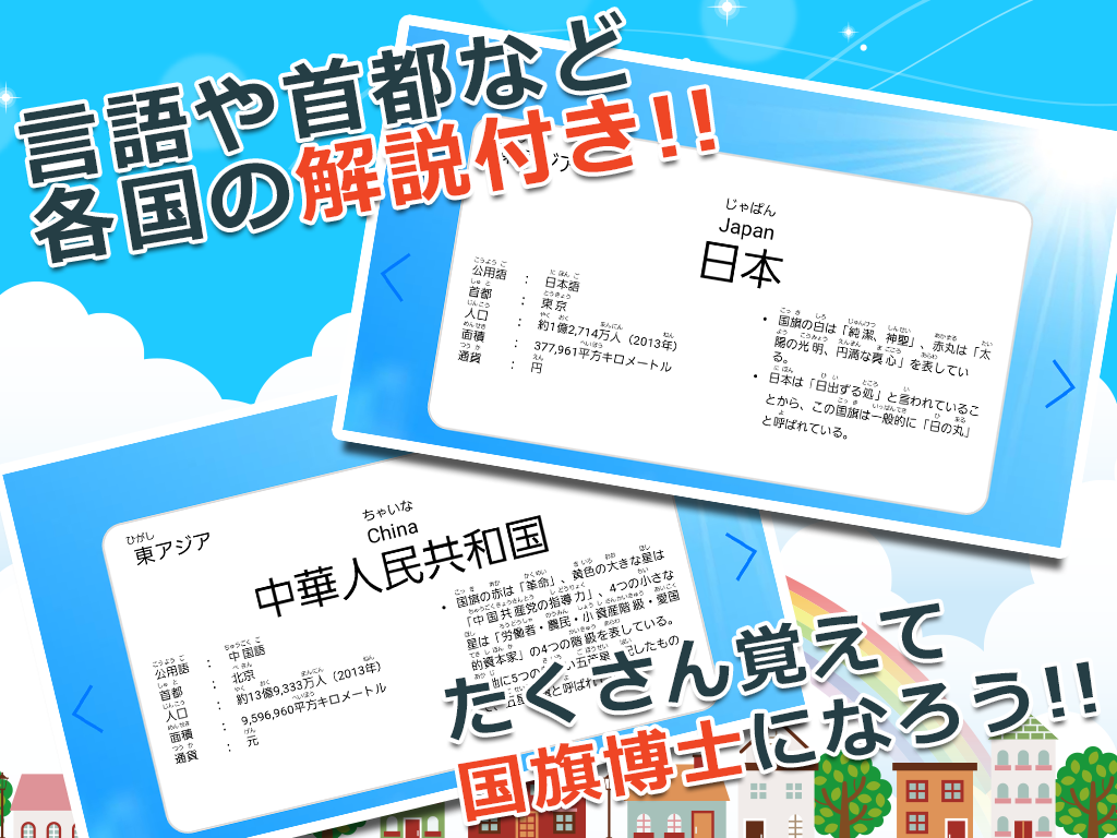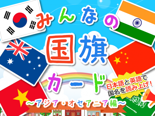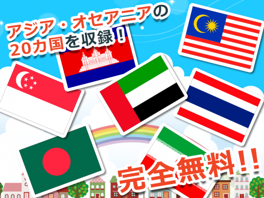 アプリには、日本、中国、韓国、オーストラリアといった目にすることの多い国旗や、はじめて聞いた国の珍しい国旗まで色とりどりの国旗が全部で20国分収録されています。画面いっぱいに国旗が表示されるのでデザインの細部までよく見て知ることができます。また、日本語と英語で国名を読み上げますので、正確な発音を自然に覚えることができます。
