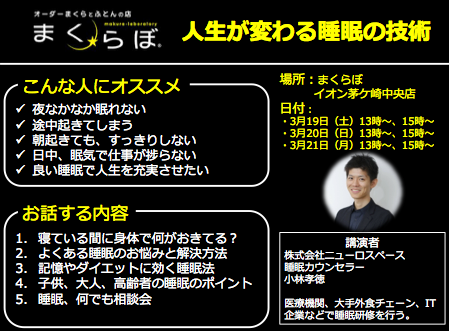 産業現場での睡眠改善と生産性向上を専門とする株式会社ニューロスペースでは2016年3月19日、20日、21日の3日間にかけて、株式会社大和屋ふとんが運営する「オーダーまくらとふとんのお店 "まくらぼ" 」イオン茅ヶ崎中央店にて「人生が変わる睡眠の技術」セミナーを開催いたします。