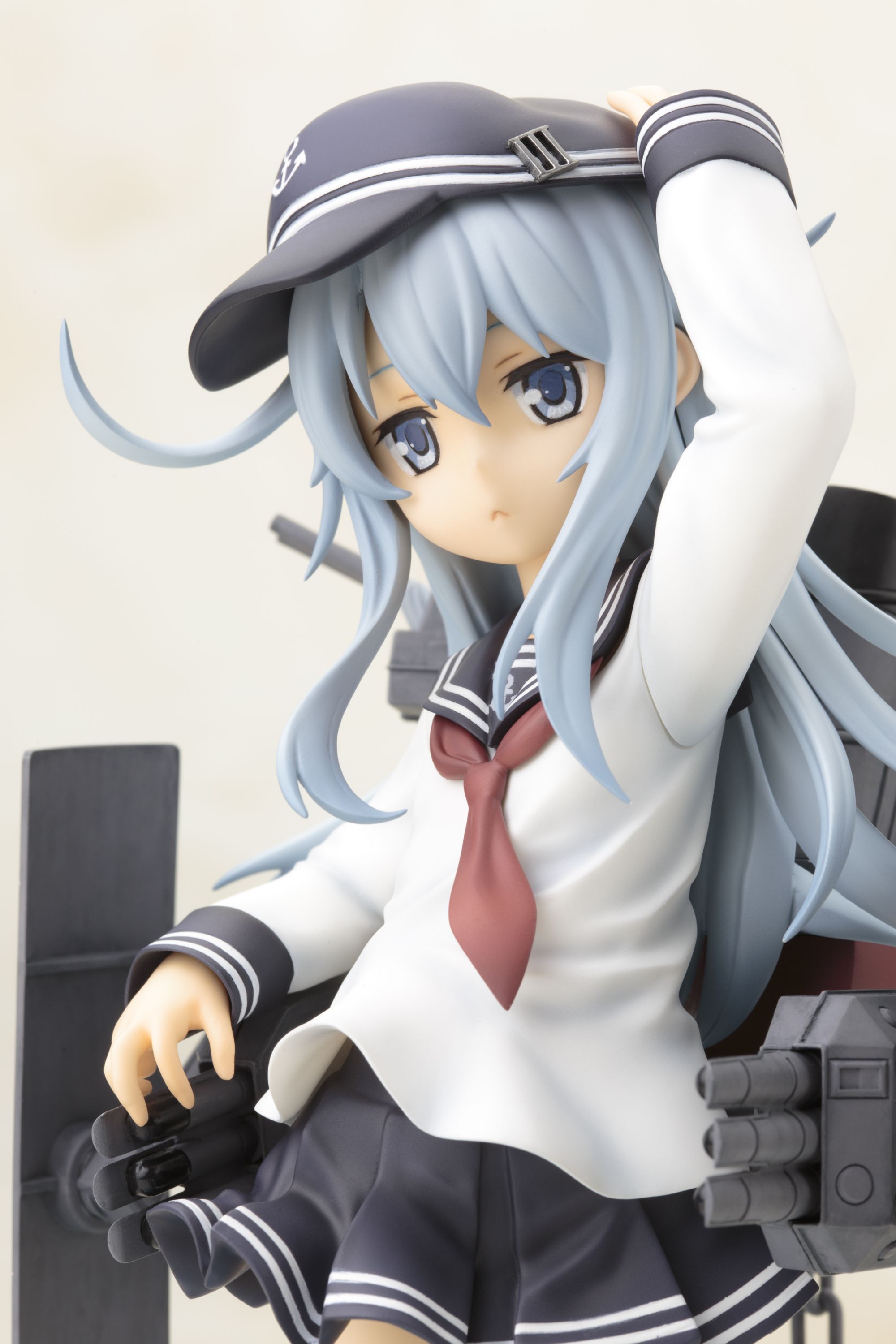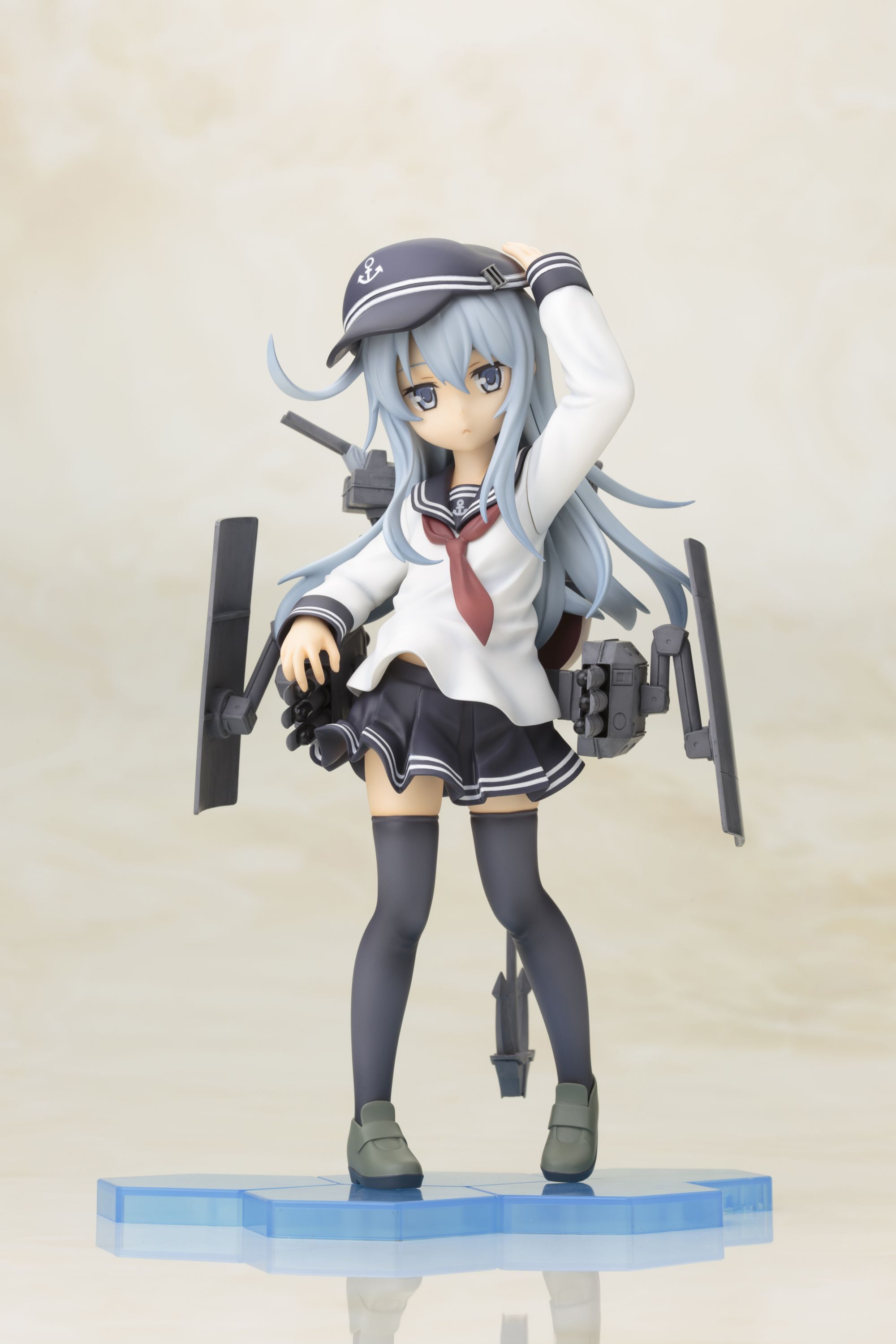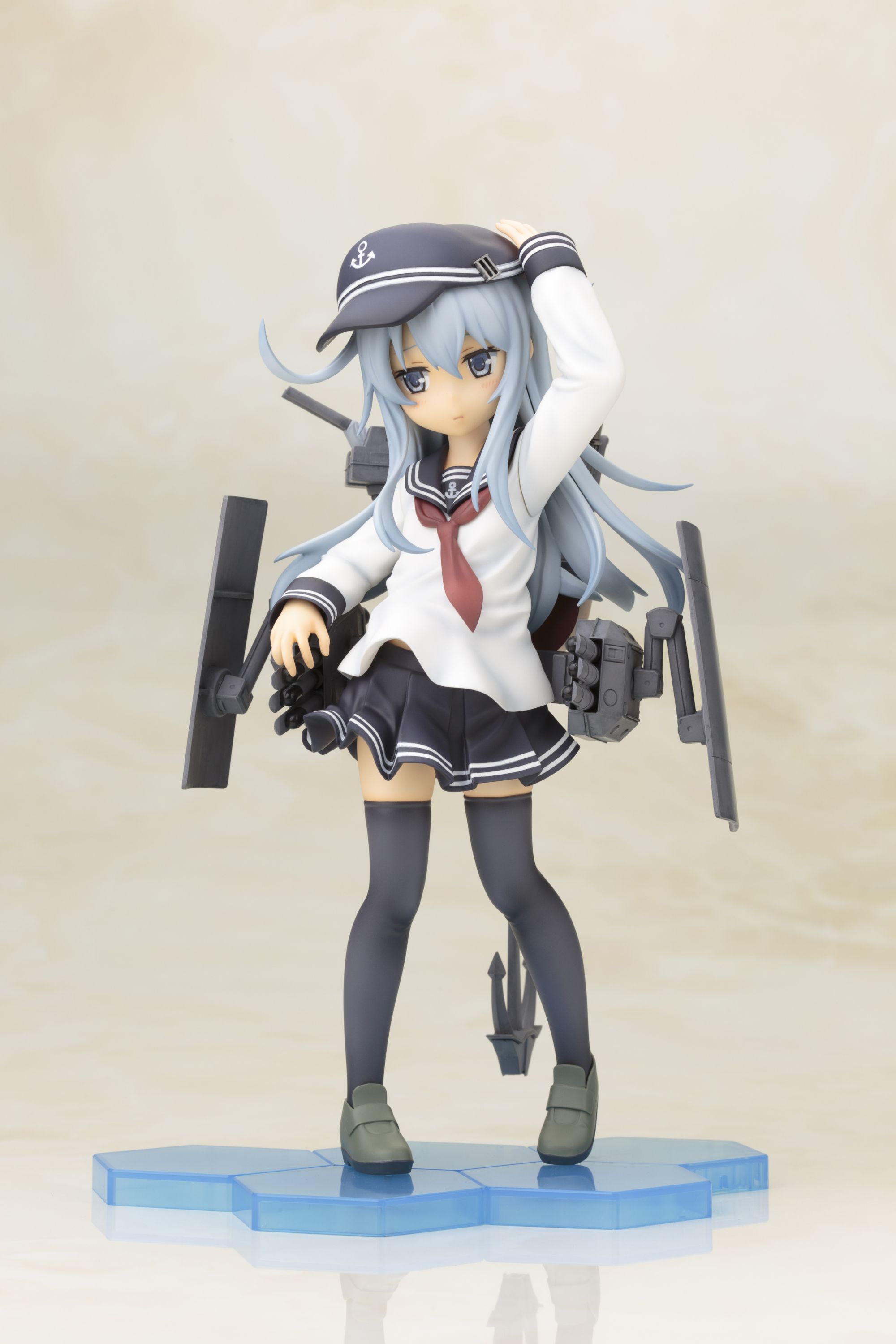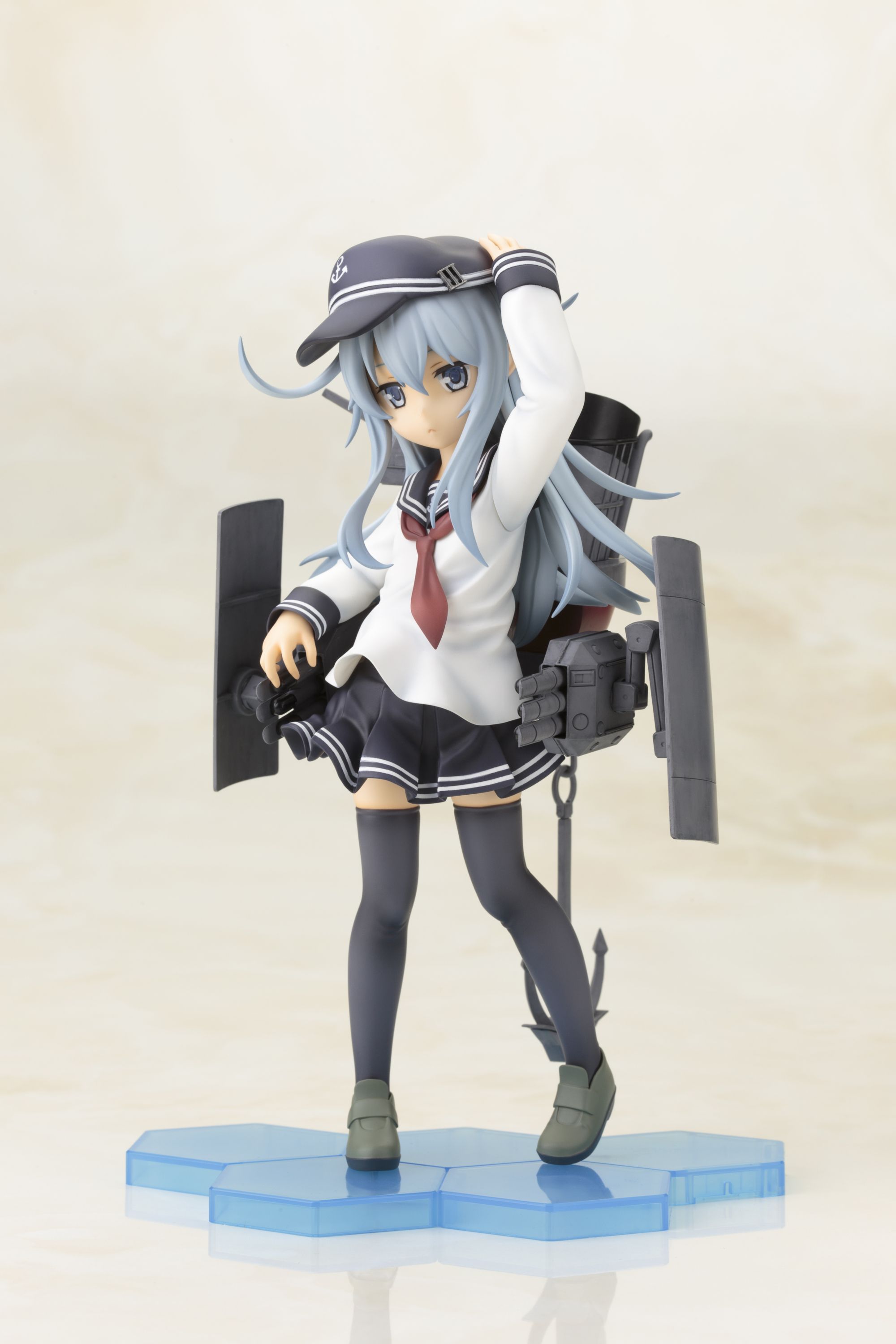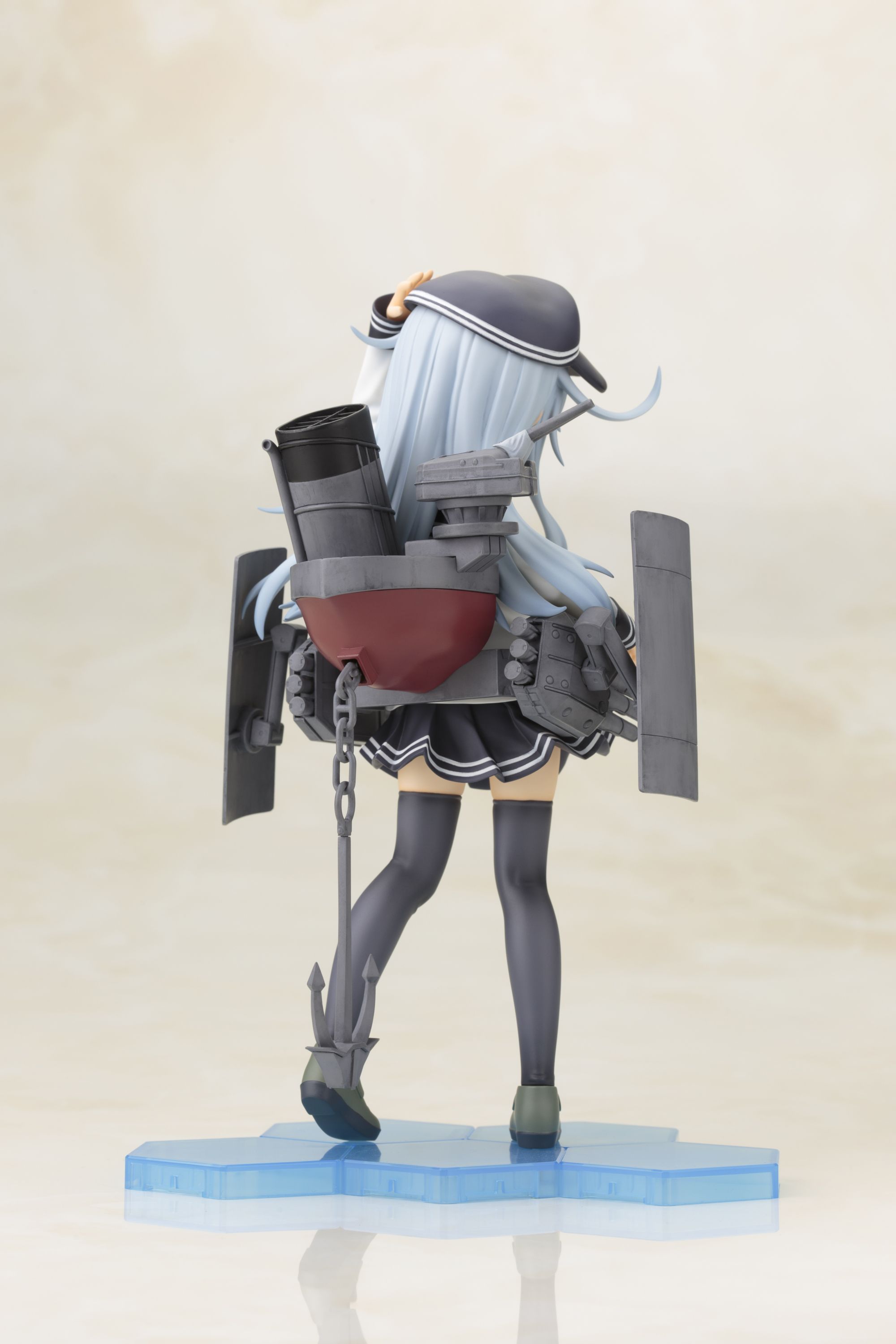 可愛らしいキャラクターデザインや艤装細部もアニメ設定を再現し、達観したような澄ました表情と凛々しいとポージングは、「不沈艦」とよばれた「響」らしさが表現されています。艤装はシールドや三連装魚雷・連装砲が可動。細部まで精密な造形と、重厚感のある塗装で仕上げました。帽子は着脱可能です。へックス構造のクリアベースは好評発売中の同型姉妹艦の「雷(いかずち)」「電(いなづま)」と接続可能。