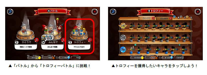 「トロフィーバトル」は、各キャラのトロフィー獲得を目指して、全国のプレイヤーとバトルを行ないます。