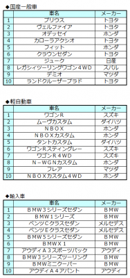 国産一般車部門は、オデッセイ(ホンダ)が約2年ぶりのランクイン、しかも3位となり大躍進を遂げました。軽自動車部門は、フレア(マツダ)が初のランクインを果たしランキングに変化をみせました。輸入車部門は、BMW3シリーズセダン(BMW)が引き続き首位独走中です。