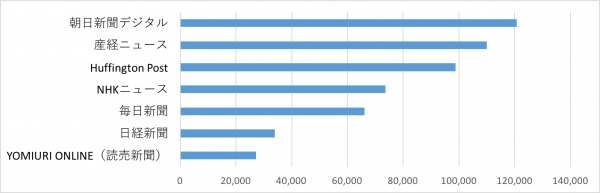「ソーシャルメディア・エンゲージメント調査」は、FacebookやTwitterなどのソーシャルメディアの中で記事がどのくらいSNSユーザーの間でシェアされ広がったかを調査するもので、SNS上でのニュース記事の影響力を測るものとして、近年欧米のニュース・メディアでは、テレビの視聴率やWEBサイトのPVと並んで重要な指標とされています。