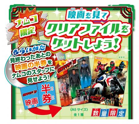 キャンペーン期間中、観賞済み映画半券をナムコのお店でスタッフに提示されたお客様に、A5サイズのオリジナルクリアファイル(数量限定/全1種)を1つプレゼントいたします。