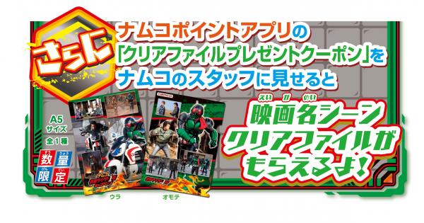 さらに「ナムコポイントアプリ」の「クリアファイルプレゼントクーポン」をキャンペーン実施店で使用すると「映画名シーンクリアファイル」(数量限定/全1種)がもらえます。