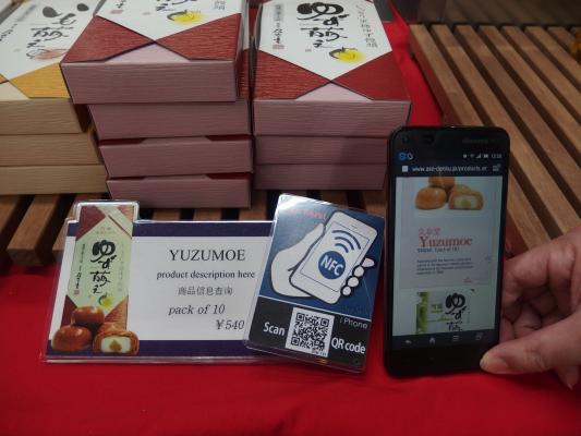 道の駅阿蘇館内にある「阿蘇プレミアムコーナー」(国内外のコンテスト等で受賞した阿蘇の特産品販売コーナー)の商品POPにNFCタグをつけ、お客様がスマートホン(android)をかざすと自動的にwebページが開き、商品情報をご紹介します。Webページはスマートフォン設定言語によって日本語・英語・中国語に自動的に振り分けられるため、外国人旅行者にもより分かりやすく商品をPRできます。