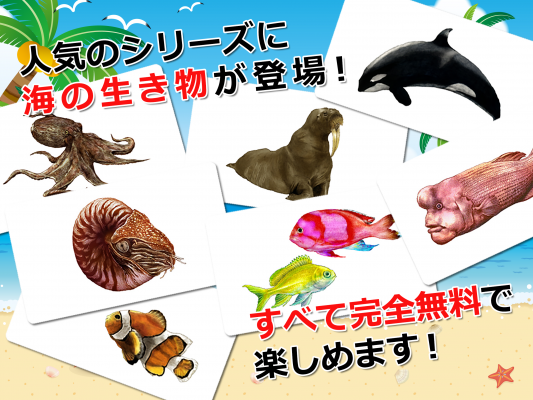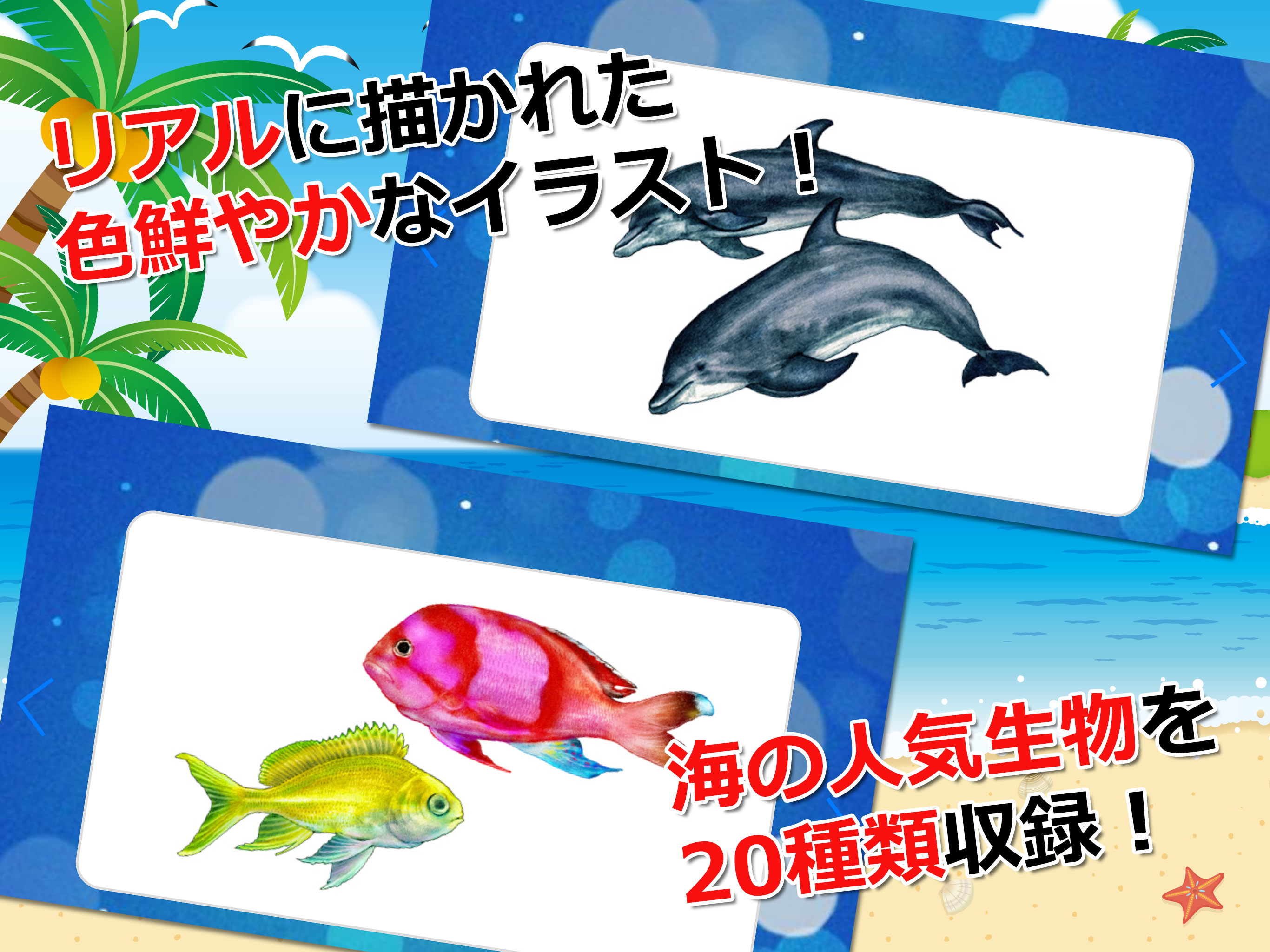 アプリには、テレビや映画でも人気のイルカやクマノミから、水族館でしか見られない珍しいクラゲやカニなど全部で20種が収録されています。全てがプロのイラストレーターによるリアルな描写のイラストで、生き物の形をはっきり捉えることができます。また、日本語と英語で生き物の名前を読み上げますので、正確な発音を自然に覚えることができます。
