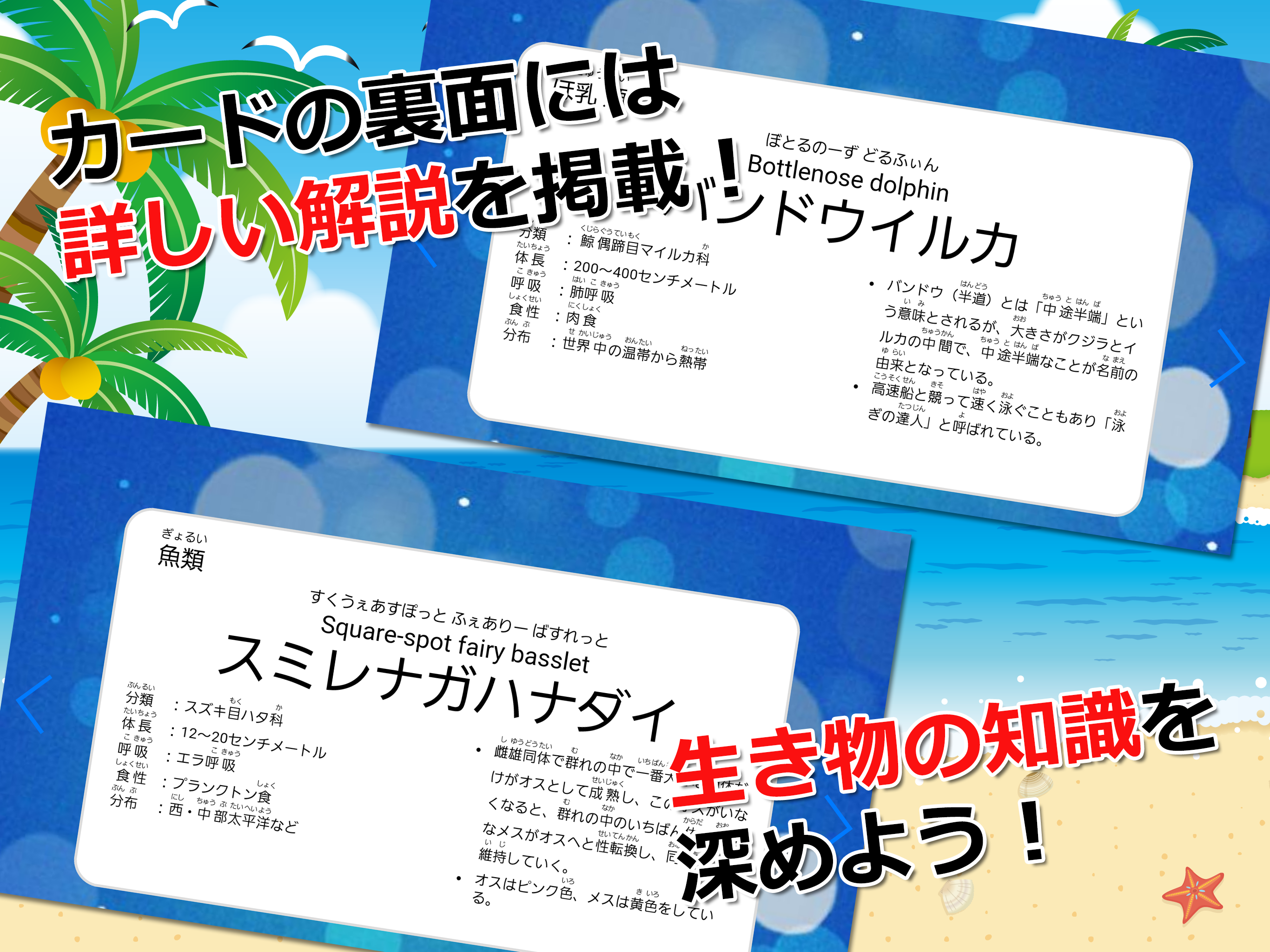 フラッシュカードのように、高速でカードのオモテ面をめくって行き、名前を当てさせることで子どもの右脳を鍛えることもできますし、生物学上の分類や生態など、子どもにはやや難易度の高い説明は、子ども達の探究心や好奇心をくすぐります。