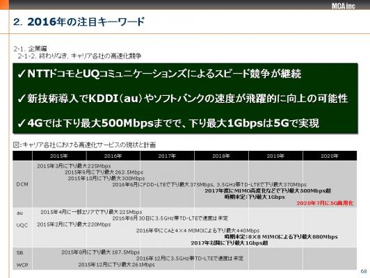 さらなる高速化に関しても、NTTドコモが2016年に同370Mbpsへの増速を、UQコミュニケーションズも2016年以降、CAと4×4 MIMOによる同440Mbpsを計画する。2017年度には、NTTドコモがMIMO高度化などによる同1Gbpsの提供を目指す。そして、いよいよ、2020年には現在、標準化が進められている5Gの導入が見込まれる。