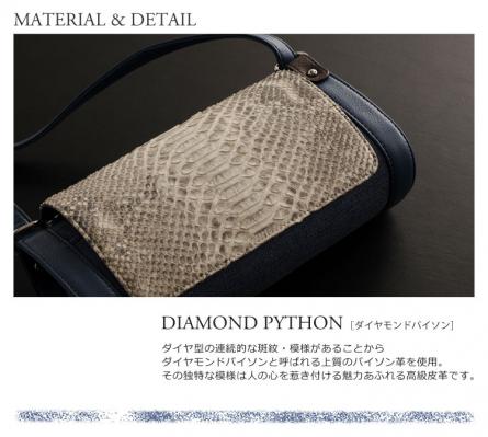 新作のミニショルダーバッグには、ダイヤ型の連続的な斑紋・模様が特徴の高級素材「ダイヤモンドパイソンレザー」と爽やかな「インディゴブルーのキャンバス地」の2つの素材を使用しております。