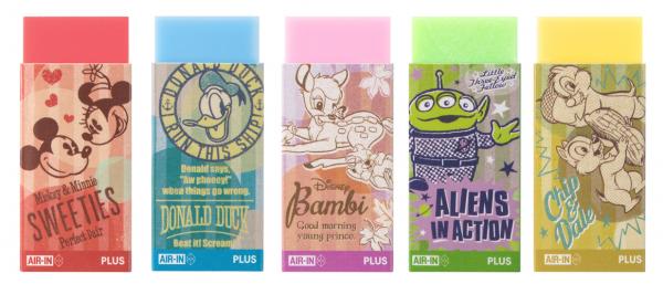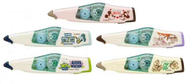 デザインは2製品共通、ミッキー&ミニー、ドナルドダック、バンビ、エイリアン、チップ&デールの5種類。メーカー希望小売価格(税抜)は、修正テープ「ホワイパーPT」が300円(交換テープは定番品と共通で130円)、消しゴム「エアイン」は130 円です。