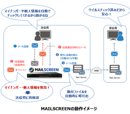 「MAILSCREEN」は、送信メール内にマイナンバーやクレジットカードなどの重要な個人情報の存在をチェックし、個人情報を発見した場合には、「送信遮断」、「承認後送信」、「暗号化後送信」等の処置の中から事前に設定しておくことで自動的に処置されますので、個人情報を含むメールの誤送信を防止します。