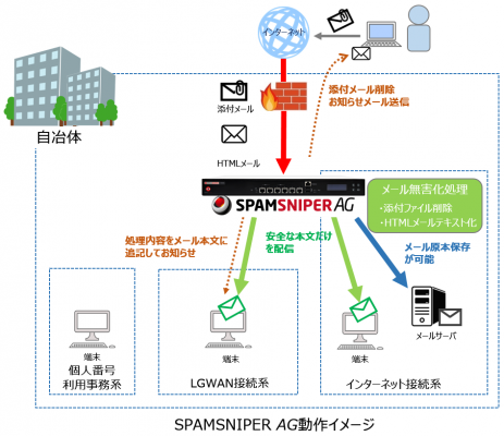 「SPAMSNIPER AG」は、すでに国内500社以上の企業・団体に導入実績のある統合メールセキュリティソリューションSPAMSNIPERの技術をベースに、メールフィルタリング機能を強化・拡張し、インターネット経由で送られる添付ファイル付きメールの遮断や添付ファイルの削除、また、HTMLメールをテキスト化する機能によって、電子メールを無害化します。