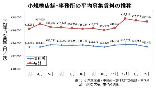 池袋の小規模事務所(20坪以下)の2月度平均募集賃料は、前月から2.3%下降しました。
