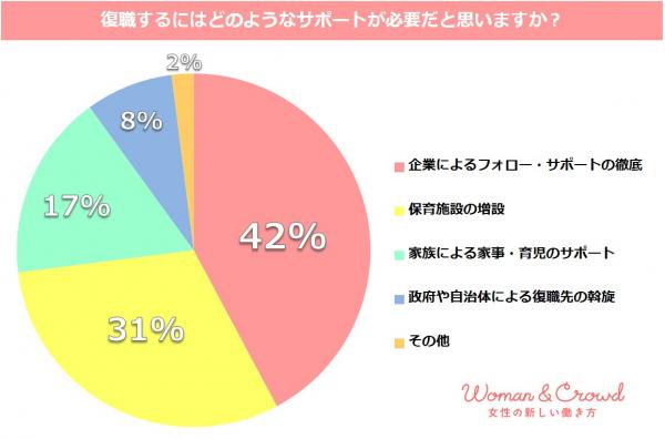 離職を経験した女性たちへ「復職するにはどのようなサポートが必要か」を尋ねたところ、42%の女性が「復職には企業によるサポートが必要不可欠である」と考えていることがわかりました。昨今話題になっている「保育施設の増設」については、31%の女性が最も優先度が高いと感じている結果となりました。