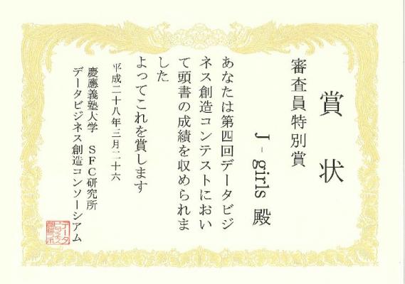 『第4回 データビジネス創造コンテスト』の実質3位である「審査員特別賞」に、