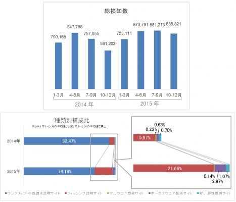 2015年1年間に検知した検知数は平均で835,999件と前年平均に比べて約16%増加しました。また、4半期ごとにみてみると2015年7-9月は881,273件と2014年以降過去最高の検知数となっており、2014年10-12月以降増加傾向にあります。また、種類別にみてみると、2014年はワンクリック・不当請求詐欺サイトが大半を占めていましたが、2015年はフィッシング詐欺サイトや偽ソフトウエア配布サイトが増加しています。要因としては、スマートフォンをはじめとしたインターネットサービスの利用の増加に伴い、「手口の多様化」を図っていることが考えられます。