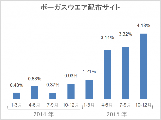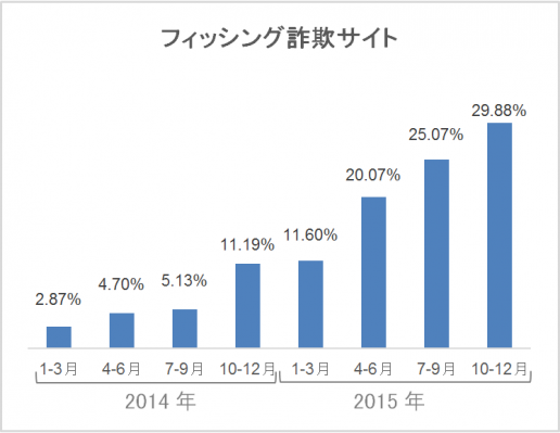 2015年フィッシング詐欺が占める割合が多くなりました。2014年1-3月に2.87%だったのが2015年10-12月は29.88%と10倍になっています。その手口の多くは銀行からの電子メールになりすまして、インターネットバンキングのID・パスワードなどの個人情報を不正に取得するほか、有名ブランドを模倣した偽販売サイトやオンラインゲームでID・パスワードを盗むという手口も見られました。本物のサイトを完全コピーするもしくは似たようなデザインで作ることによりユーザーを騙す手口は今後も増加することが予想されます。