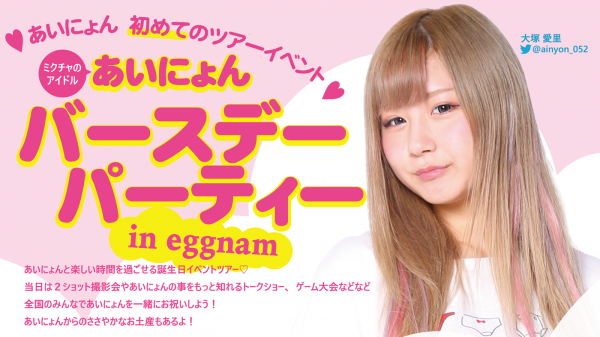 株式会社ナムコは、モデルの「あいにょん」こと大塚愛里さんの自身初となるツアーイベント「あいにょんバースデーパーティー in eggnam」を全国3か所で開催します。