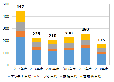 図:基地局向けアンテナ、ケーブル、電源、蓄電池市場規模推移と予測(2014~2019年度、単位:億円)