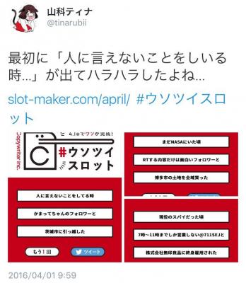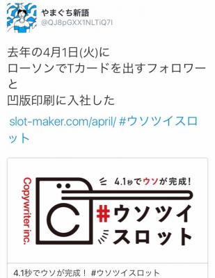 株式会社コピーライター(本社:東京都渋谷区富ヶ谷、代表取締役CEO:長谷川哲士、以下職種名と混在するので「株式会社コピーライター」)は、2016年4月1日に、誰でもウソを4.1秒でつくれる #ウソツイスロット をリリースしました。