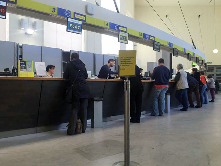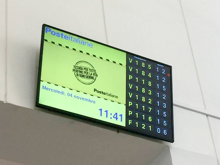 このカスタマイズされたオール・イン・ワンシステムは、顧客がイタリア郵便局のモバイルアプリによって予約を行なう待ち行列管理システムの一部として、各窓口に設置されています。顧客が郵便局に到着すると、窓口にあるディスプレイが、アプリに割り当てられた予約にしたがって、顧客の順番になると、どの窓口に進むべきかをお知らせします。