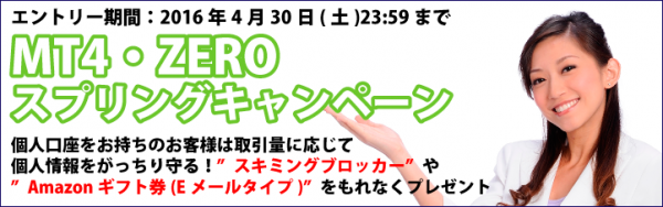 FX取引サービス「MT4・ZERO」を提供する外為ファイネスト株式会社(本社:東京都千代田区、代表取締役:石野由美子)は、2016年4月1日より、取引量に応じてカードの個人情報をガッチリ守るスキミングブロッカーやAmazonギフト券をプレゼントする『MT4・ZEROスプリングキャンペーン』を開催中です。
