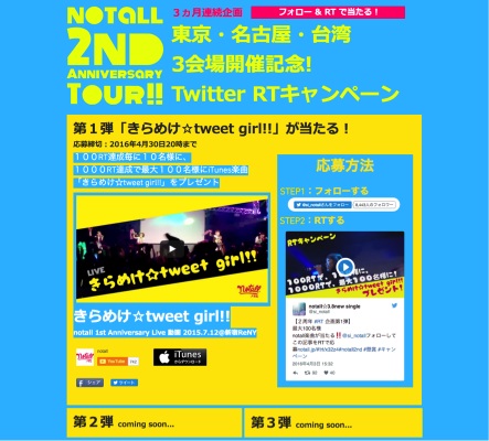 第1弾は、フォロー&リツイートで、100RT達成毎に10名様に、1000RTで最大100名様に、notallの人気楽曲「きらめけ☆tweet girl!!」をプレゼントいたします。