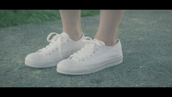 大泣きしながら河川敷を歩く松岡さん。周りは春を感じさせるような風、そして風景が広がっています。とことん泣き尽くした松岡さんの目にはどこか力強さを感じます。足元にはそんな気持ちを表すかのような真っ白なCONVERSEが。
