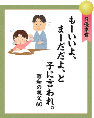 非常に危険な香りがするこの一句に、警告の意味をこめて一票です。何が危険なのか。親が子供のことを見ていないからです。子供の人生に、親の理想を押しつけてしまっているからです。子供はいつまでたっても、自分のために勉強しているのか、親のために勉強しているのか、わからないままになってしまうでしょう。しかしまあ、この詠み人は、自分を客観的にとらえていて、こうやって川柳にして、自分を自分で笑い飛ばせるのですから大丈夫です。危険なのは自覚ができていないことです。さあ、みなさんも胸に手を当ててこの句を3回詠んでみましょう。(おおたとしまさ氏)